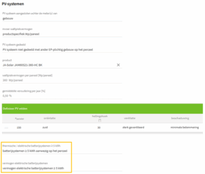 De invoer van batterij opslag is op gebouw niveau. Als er meerdere PV systemen aanwezig zijn is de invoer van batterijsystemen automatisch bij alle PV systemen gelijk. Wanneer de invoer op één PV formulier wordt aangepast, wijzigt deze automatisch ook op de andere PV formulieren.